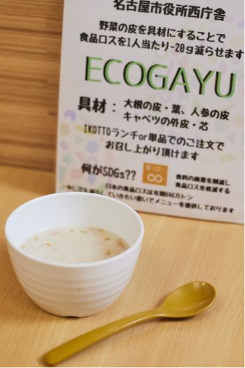 調理で余った大根やにんじんの皮、キャベツの芯などを具材にした「エコ粥」。食品ロスを一食当たり約20グラム減らせます。一人でも多くの人に地球環境や食の未来について考えてもらいたいと、このようなポップやポスターを食堂内のあちこちに掲示しています。