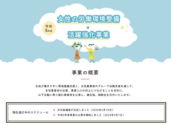 いずれも農業の現場における女性の活躍を支援する事業です。より女性が活躍できる仕事場やグループ活動を検討している方は、事業ページをご覧下さい!