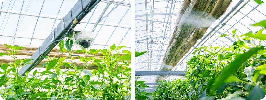 (左)(上)ハウス内には4台ものカメラを設置し作物の生育状況や病気の有無を確認