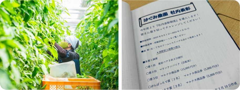 「給与基準評価制度と社内表彰制度の2種類を設けています。ひとつは給与の評価基準で、収穫や生産管理などの区分からさらに各作業単位で5段階評価を行います。もうひとつは自己申告も加味した社内表彰制度で、7月末の期末に表彰会を行うのですが、1位の商品は2泊3日の東京ペア旅行券とあり、なかでも外国人スタッフたちは大盛り上がりです!」