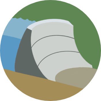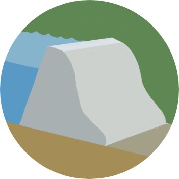上流へアーチ状に張り出した構造のコンクリートダム。アーチを利用して外力を両岸や底の岩盤に分散させて支えます。堤体を薄くできるため、コンクリートの量が少なくてすむ反面、建設は周囲の地盤が強いところに限られます。アーチを複数重ねるタイプを「マルチプルアーチダム」と呼びます。