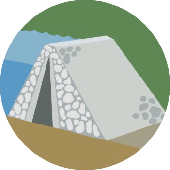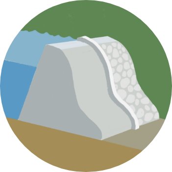 堤体の材料として主に岩石や砂利、土質材料などを使用するダム。堤体の底面積が広くて重量が分散されるため、比較的軟弱な地盤でもつくることができます。ダム本体内部に遮水壁が設けてあるゾーン型のうち、遮水ゾーンの位置が中央にあるものを中心遮水ゾーン型、ゾーンが斜めに設置されているものを傾斜遮水ゾーン型と呼びます。