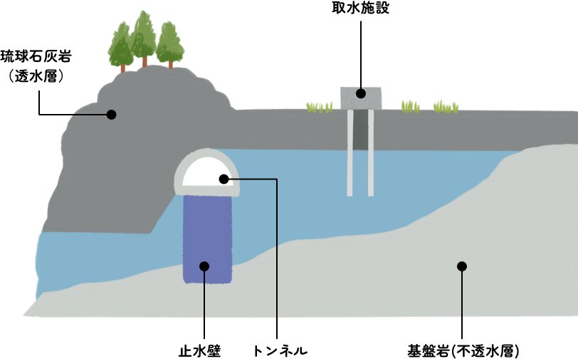 沖縄県や鹿児島県の島嶼部では、地下水が貴重な水源です。しかし地下水は地下に浸透すると、すぐに海に流出してしまうため、大規模な農業は営めません。そこで地下水の下流側の地中に止水壁を設けて、隙間の多い琉球石灰岩層に水を貯めるのが地下ダムです。