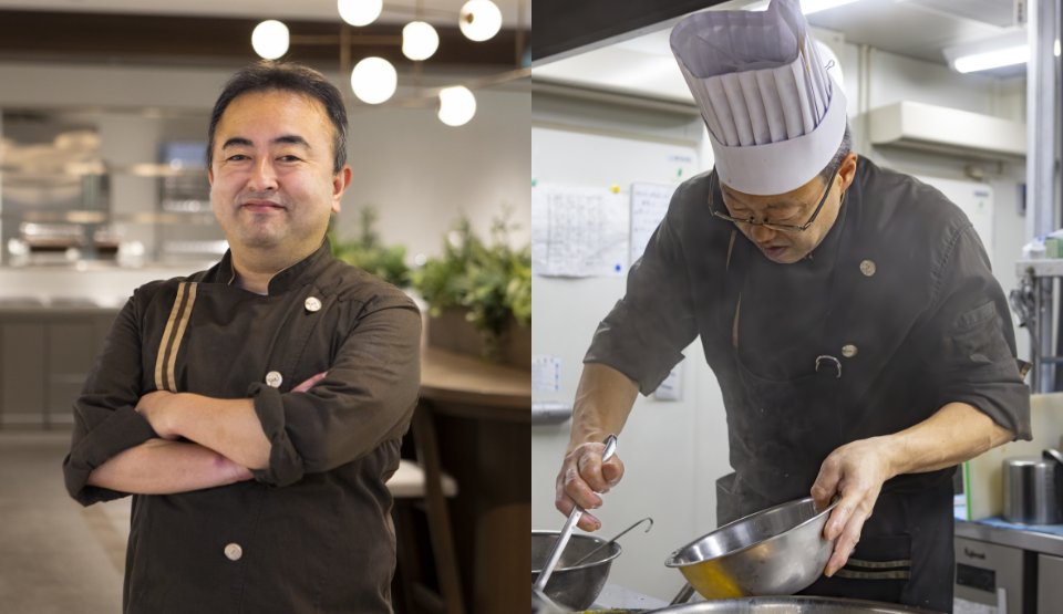 (左)「MONOSUS社食研」を率いる、食事業開発ディレクターの荒井茂太さん。グーグルジャパンの初代フードマネージャーとしても知られる。(右)荒井さんと長年タッグを組んでいる、料理長の飯野直樹さん。