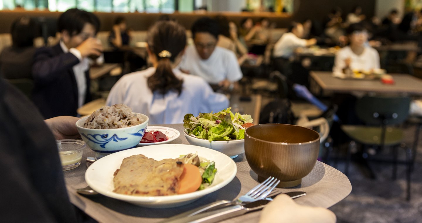 登録有形文化財の旧九段会館を一部保存しつつ建て替えたレトロモダンなオフィスビル、九段会館テラス。「九段食堂 KUDANーSHOKUDO for the Public Good」は、同ビルに入居している複数企業でシェアする社員食堂です。ビルワーカーだけでなく、一般客も利用可能。2022年10月のオープン以来、旬の上質な食材をふんだんに使った料理のクオリティが評判を呼び、今では一日の利用者数が500人近くに上るといいます。ひとたび料理を口にすれば、きっとその滋味深さに驚き、大きな満足感が得られるでしょう。運営を手がける(株)モノサス「MONOSUS社食研」のモットーは「Good Food, Good Job! 良い職は、良い食から」。ウェルビーイングな食事は、まさに仕事の活力源となってくれそうです。