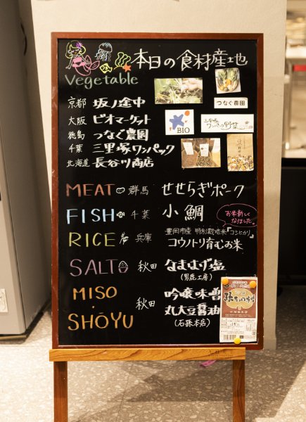 券売機の横には「本日の食材産地」の立て看板が。野菜、肉、魚、米に加え、調味料の生産地とブランド名も並びます。随所に生産者へのリスペクトを感じさせる食堂です。