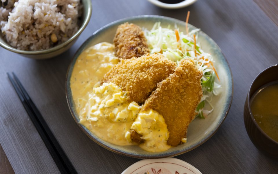 魚が主菜のこの日の定食は「サーモンと千葉県産小鯛のフライ 自家製タルタルソース」。魚は料亭御用達の仲卸から、余剰分を特別にお裾分けしてもらっています。前日の夕方まで何が届くかわかりません。だからいつもメニューが決まるのは直前。数量限定、売り切れ次第終了です。