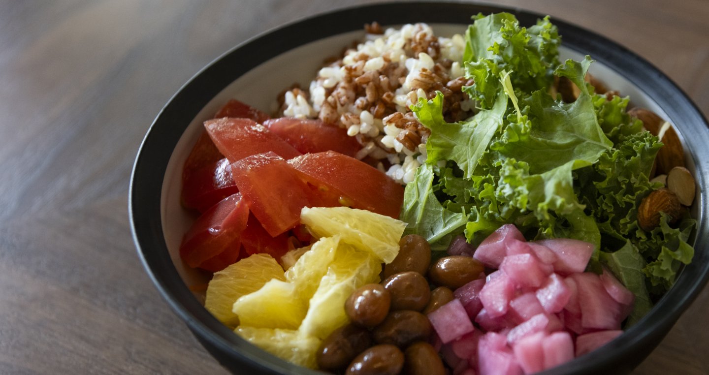 メニューは定食3種類、サラダボウル3種類、丼、カレーハヤシの計8種類。週替わりのサラダボウル以外は基本的に日替わりです。野菜は有機農産物を中心に使用。生命力にあふれた、みずみずしい旬の野菜は健康維持に大いに役立ちそうです。仕入れは(株)モノサスのグループ会社で徳島県にあるフードハブ・プロジェクトをはじめ、日本各地の信頼できる小規模農家から。「日々直送されてくる野菜の種類と量に応じて、メニューを柔軟に調整しています。『九段食堂』にはレギュラーメニューがないので、仕入れの制約がないんです。だから数が揃わなかったり、小売りしにくかったりする収穫物も受け入れられる。我々がある程度の買い取り量を約束すれば、小規模な有機農家も安定した経営ができます。食品ロス削減にもつながりますよね」と荒井さん。“特定多数”を相手にする社員食堂ならではの取り組みです。