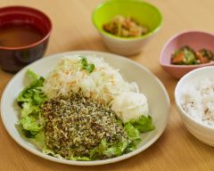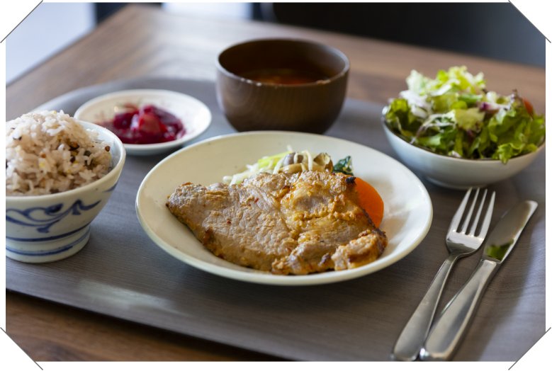 群馬県産のブランド豚「せせらぎポーク」は、さまざまな調理法で登場する「九段食堂」の定番的食材。たっぷりの甘味ときめ細やかで柔らかい肉質が特徴です。この日は味噌漬けにして焼き、コクとうま味をプラス。雑穀を混ぜた兵庫県産の「コウノトリ育むお米」を炊いたごはんが進みます。(ビルワーカー1,370円/一般1,470円)