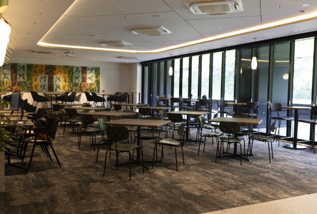 地下1階なのに明るい自然光が入る「九段食堂」。カフェのようなおしゃれな雰囲気が印象的。ランチタイムには、ビルのテナント企業に勤務する人たちが、会社の垣根を越えて席を共にします。