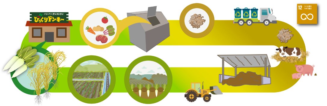 ハンバーグレストラン「びっくりドンキー」などを運営する(株)アレフが取り組んでいるのは、自社の飲食店から排出された食べ残しや食品残さを価値あるものとして再生するリサイクルループです。食品廃棄物を生ごみ処理機で堆肥の原料に変え、家畜の糞尿とともに発酵させて堆肥に。これを使用した農場で栽培された米や大根を、一部の店舗で食材として活用。食品廃棄物が循環する仕組みができています。