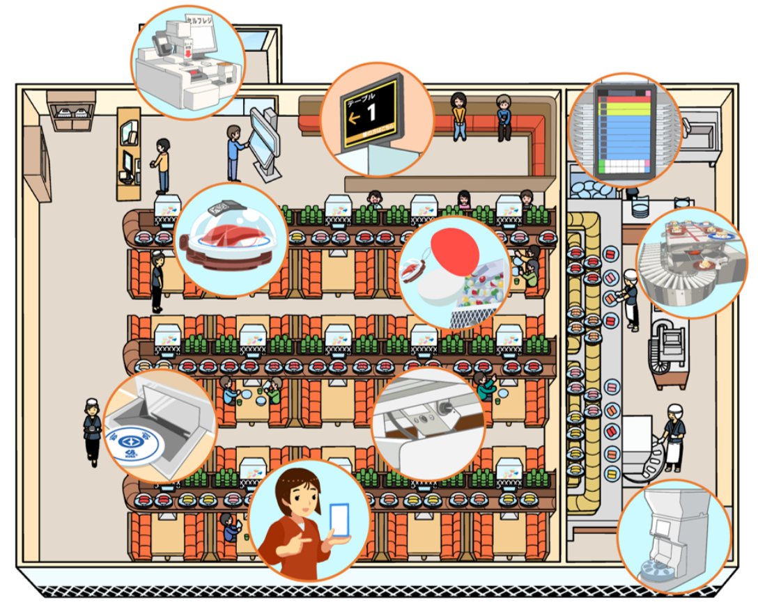 回転寿司チェーンとして知られる「くら寿司」の店舗は、自動案内やセルフチェックなどのシステムと組み合わせ、入店から退店まで従業員を介することなくサービスの提供が可能となる非接触型サービスを導入し、生産性向上に大きな改善を図りました。こうしたシステムをすべて自社で開発。営業の実態に最適化した仕組みを構築できる点も強みです。