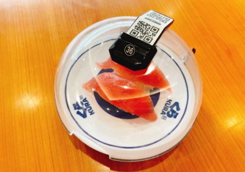 寿司カバーにつけたQRタグによって、レーン上の寿司などの提供後の経過時間を管理。滞在時間によって消費皿数(食べる量)を予測して厨房に表示することで、レーンに流す皿数を最適化し、廃棄ロスを軽減します。