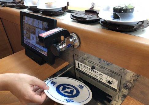 寿司が流れるレーンの上部に設置された小型カメラの画像分析により、どのテーブルで何枚のお皿を取ったかを、自動でカウント。