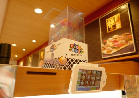 食べ終わった寿司皿を皿回収ポケットに投入すると、5回に1回抽選ゲームができます。