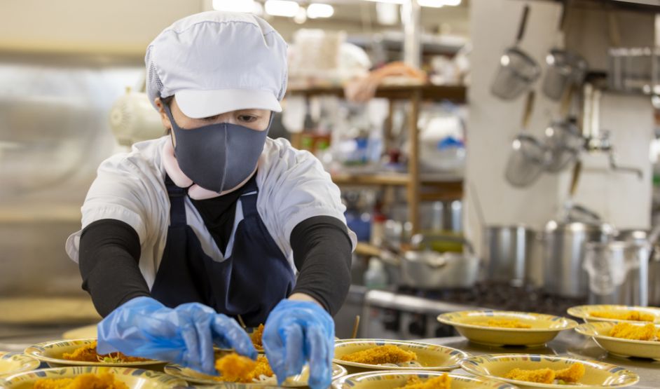 この日の日替わり定食の主菜は白身魚のフライ。ランチタイム直前に、厨房スタッフが器に次々盛り付けていきます。