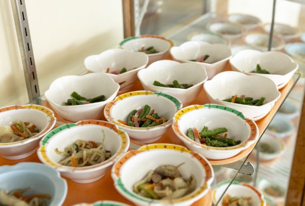 日替わり定食に付く小鉢は、棚に並んだ数種類から好きなものを自分で取ります。漬物も欲しい人が棚から取る方式。食品ロスを減らすため、セルフサービスにしたとか。