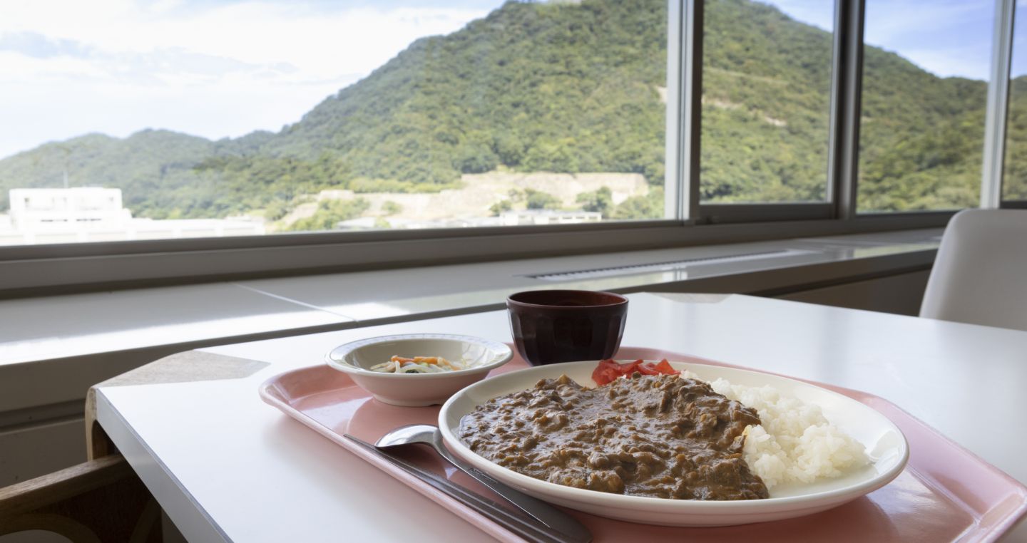 久松山(きゅうしょうざん)や鳥取市街を一望できる見晴らしの良い食堂は、職員と市民の憩いの場