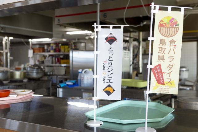 “食パラダイス”というキャッチフレーズの通り、多種多様な農林水産物に恵まれた鳥取県。なかでもジビエは注目を集める県産食材です。あちこちにアピール用のポップやのぼりがあるのが、県庁の食堂らしい。