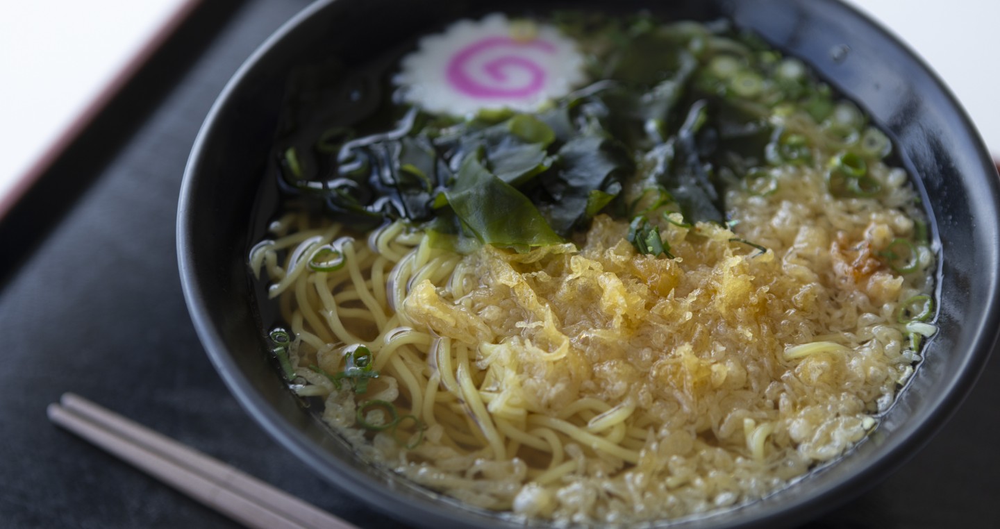 「素ラーメン」とは、うどん出汁に中華麺を入れたもの。“鳥取市民のソウルフード”とも呼ばれるご当地グルメですが、実は提供している飲食店は市内でも数えるほど。「鳥取県庁食堂」のこの定番メニューは、なかなか貴重な存在かもしれません。鰹節や昆布で丁寧にとられた和風出汁は、ほのかに甘く優しい味わい。そして中華麺とのハーモニーは意外にも絶妙。クセになるおいしさにリピートする人が多いとか。サクサクした天かすをアクセントに、あっという間に完食できます。