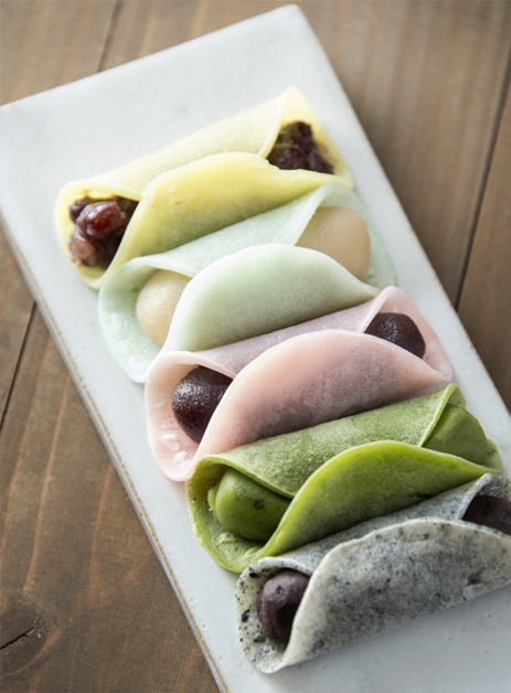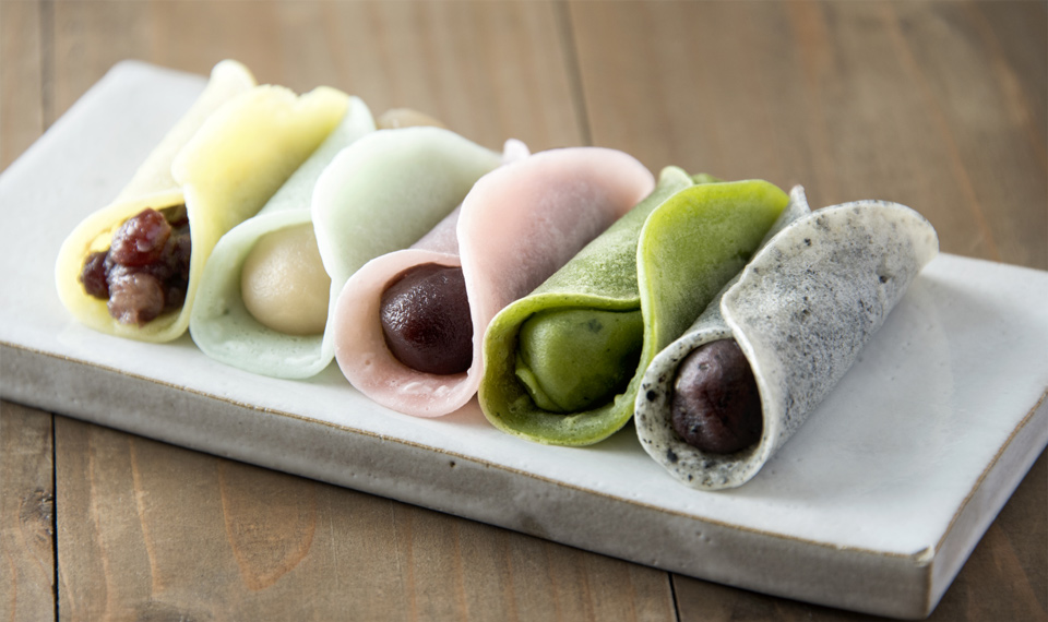 左から粒あん、白あん、こしあん、抹茶あん、ごまあん。あんことひと口に言っても、材料や製法によって風味や食感は実にさまざま。5種類を食べ比べできる、あんこ好きにはたまらない和スイーツがこちら。白玉粉を加えたもちもち生地でくるっと巻いただけの、その名も「あん巻き」です。生地をカラフルに色付けするひと手間で、一段とバリエーション豊かな見た目になりました。おもてなしにもぜひどうぞ。
