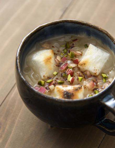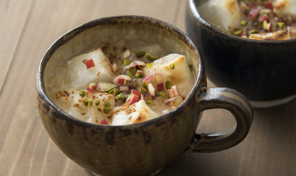 焼き餅を鍋に加え、全体が沸騰したら火を止める。器に盛り、シナモンを振って❹を飾る。