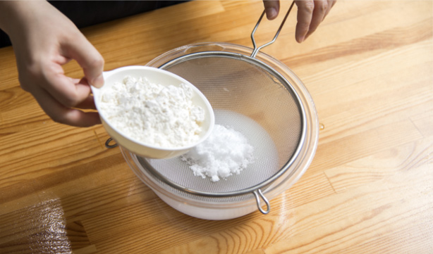 ❶に上白糖と薄力粉をふるい入れ、ダマにならないように泡だて器でよく混ぜる。ラップをして冷蔵庫で15分から30分ほど休ませる。