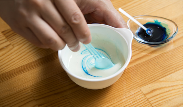休ませた生地を5等分し、少量の水で溶いた各色粉、抹茶、黒すりごまでそれぞれ色付けする。