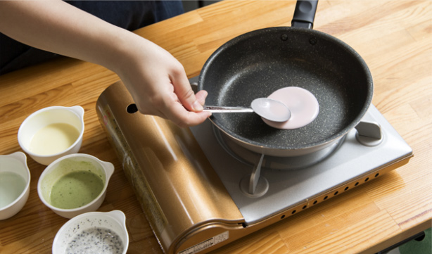 フライパンを温め、ごく薄く油(材料外)を引く。生地を大さじ1ずつ流して軽く広げ、弱火で焼き色がつかないように片面を焼く。