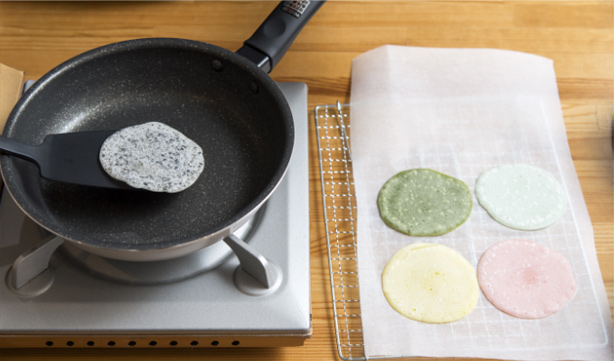片面全体が乾いたらフライ返しでひっくり返し、裏面を10秒から20秒ほど焼く。焼き終わった生地は、オーブンペーパーを敷いた網に取って冷ます。