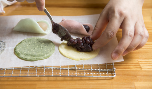 それぞれの生地にあんを約20グラムずつ載せて巻く。組み合わせ例は黄生地×粒あん、ブルー生地×白あん、ピンク生地×こしあん、抹茶生地×抹茶あん、ごま生地×ごまあん。