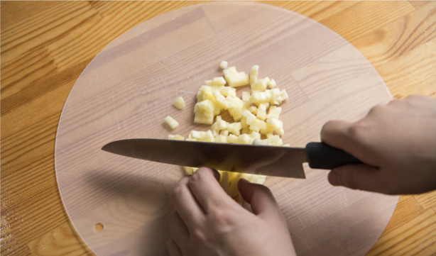 りんごの皮をむき、2ミリメートル角ほどのさいの目に切る。皮は飾り用に少し残しておく。