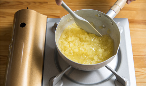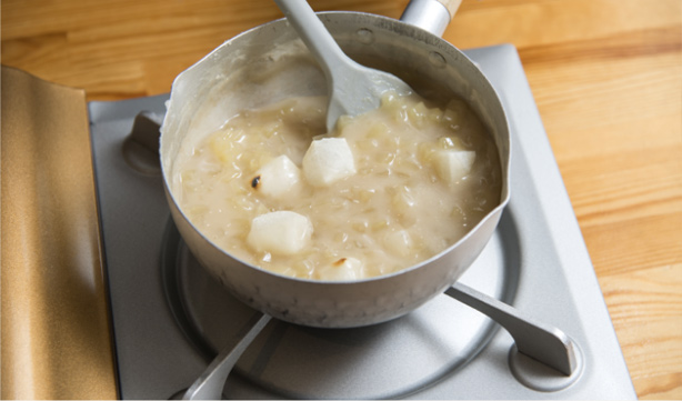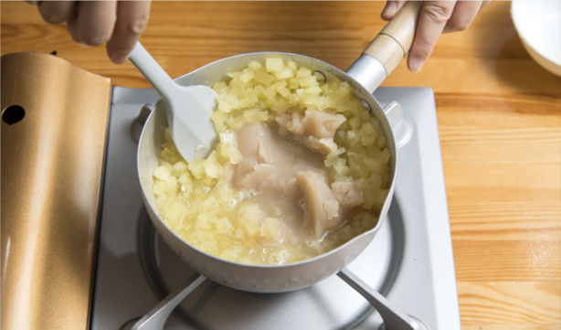 りんごが煮えたら、鍋に白あんを加え溶かす。必要であれば水を足して好みの濃さにする。