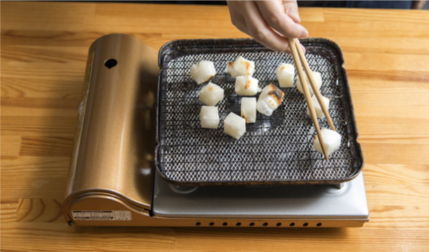 りんごを煮ている間に、切り餅を6等分して焼く。
