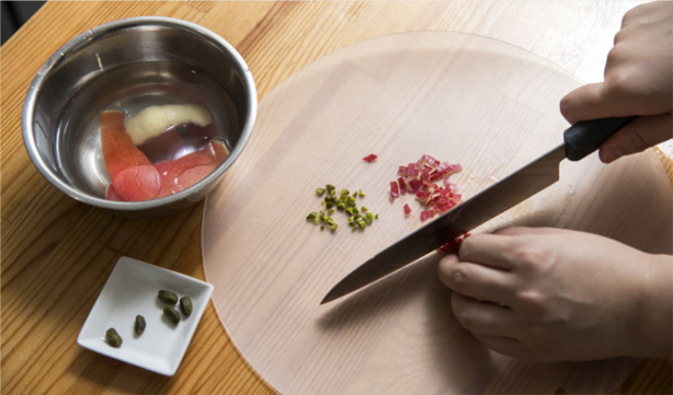残しておいたりんごの皮とピスタチオを細かく刻む。