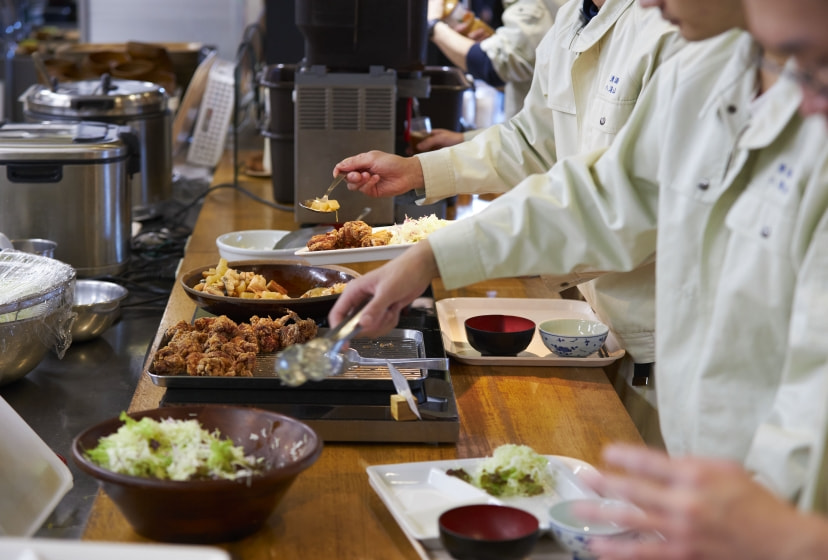 社員はオープンキッチンのカウンターで、自らおかずやサラダを器に盛り付けます。お替わり自由(※社員のみ)のごはんと味噌汁もセルフサービス。