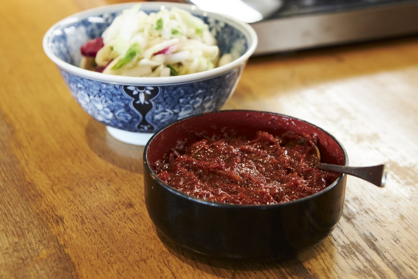 手前は手作りの「かぐら辛っ子」。魚沼の伝統野菜・かぐらなんばんを米麹と天日塩で熟成させた辛味調味料は、ごはんのお供に最適。