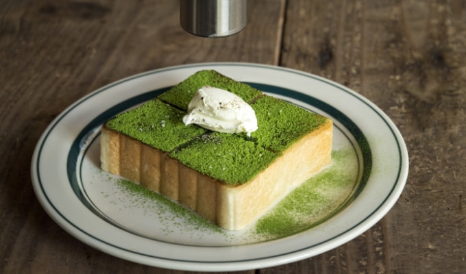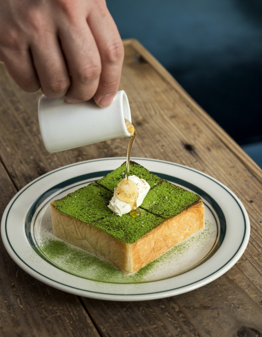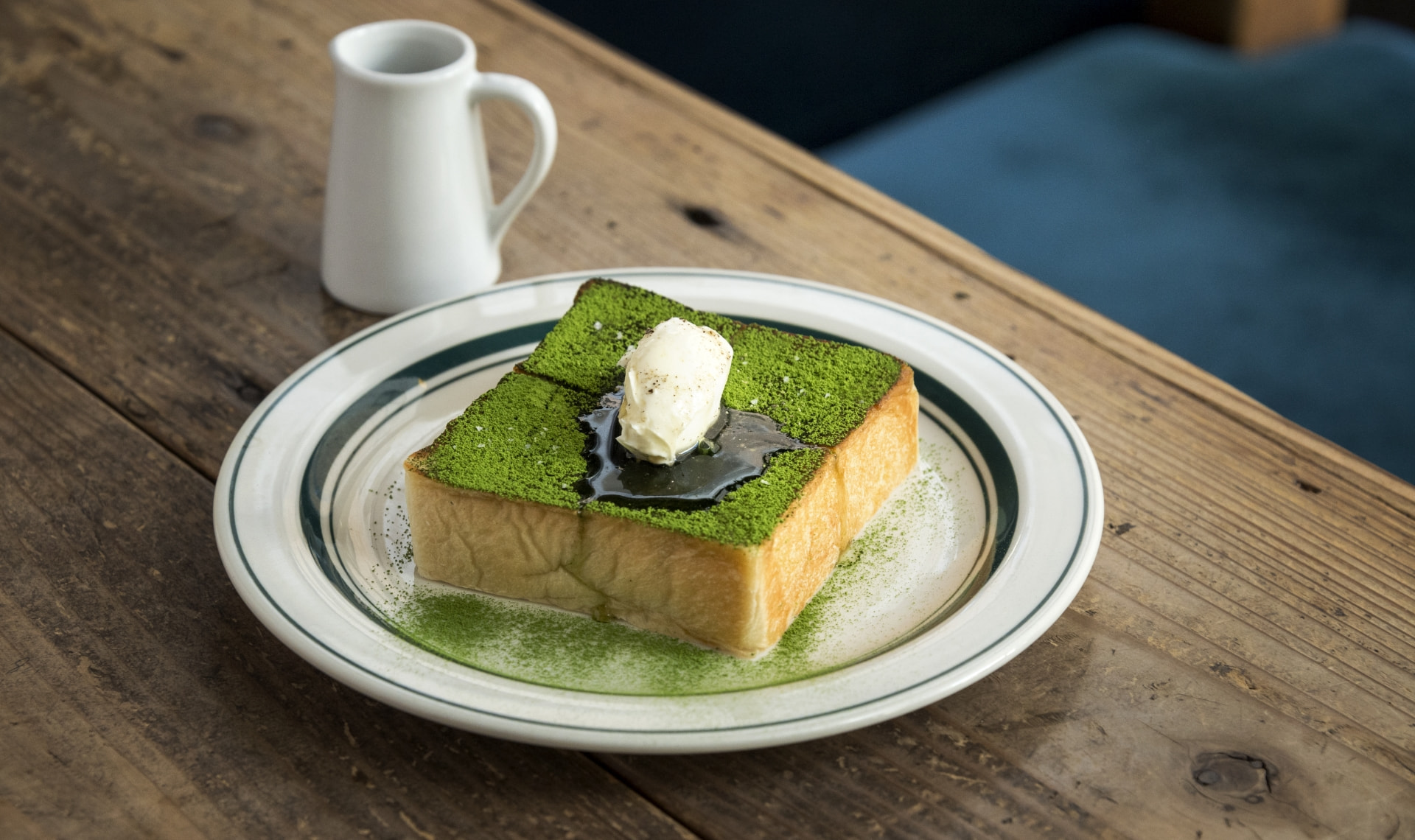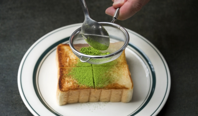 抹茶をたっぷりふりかけた、シンプルイズベストなトーストメニュー。抹茶そのものの豊かな風味が手軽に楽しめます。トーストにかける際は、ダマにならないよう茶漉しで漉しながら行うのがポイント。サワークリームをのせ、塩、ブラックペッパー、さとうきび糖シロップをかけて完成。朝食やおやつにどうぞ。
