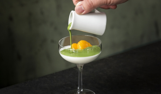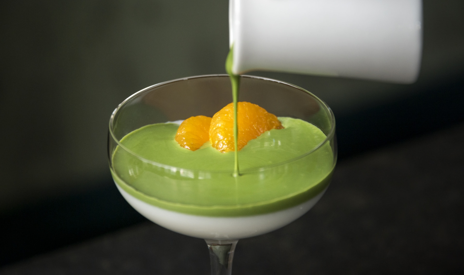 中国料理のデザートとしておなじみの杏仁豆腐は、優しい甘さとぷるぷるなめらかな食感で人気。これに抹茶ソースで和風味をプラスし、ほかにはなかなかないオリジナルの一品に。抹茶のほろ苦さが、杏仁豆腐にほんのり加えた塩気や、トッピングしたみかんの甘酸っぱさと相まって、奥深い味わいを演出します。おしゃれなグラスに盛り付ければ、おもてなしの食卓でも好評を博すこと間違いなしです。