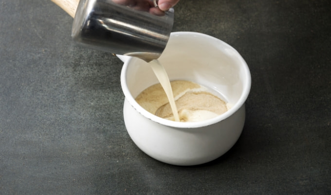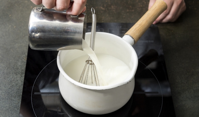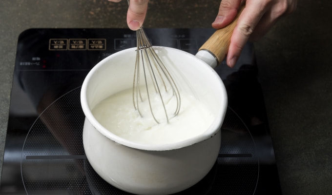 牛乳を2回に分けて入れることで、なめらかな食感に仕上がる。