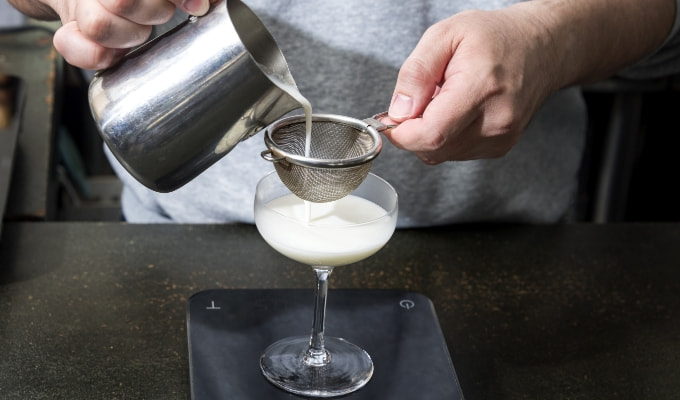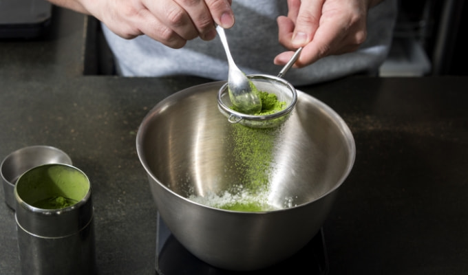 ダマになりやすい抹茶は、必ず茶漉しで漉してほぐしながら入れる。