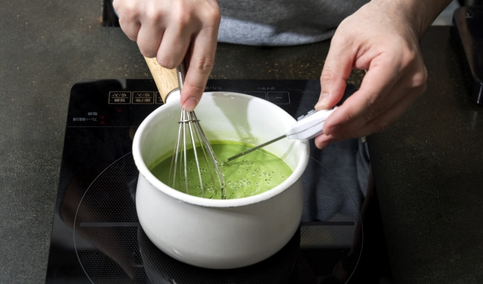 抹茶ソースを作る。鍋にさとうきび糖、生クリーム、牛乳を入れ、よく混ぜ合わせながら50度になるまで加熱する。