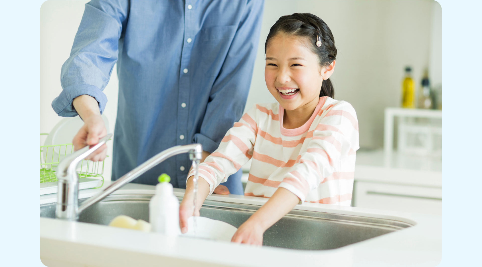 食中毒予防の第一歩は、正しい手洗いから。帰宅時や調理の前後、食事前など、こまめに手を洗うようにしましょう。時計や指輪などは手洗いの前にはずしておきましょう。