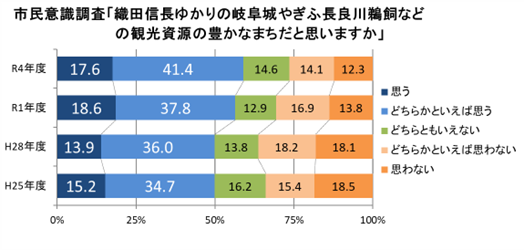 - 市民意識調査において、「織田信長ゆかりの岐阜城やぎふ長良川鵜飼文化などの観光資源の豊かなまちだと思いますか。」という設問に「思う」もしくは「どちらかといえば思う」と答えた人の割合が、平成25年度の49.9%から令和4年度は59.0%へ増加し、シビックプライド※の醸成が図られました。
