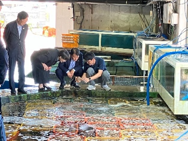 北海道から輸入・搬入されたホタテの水槽を視察する笹川副大臣