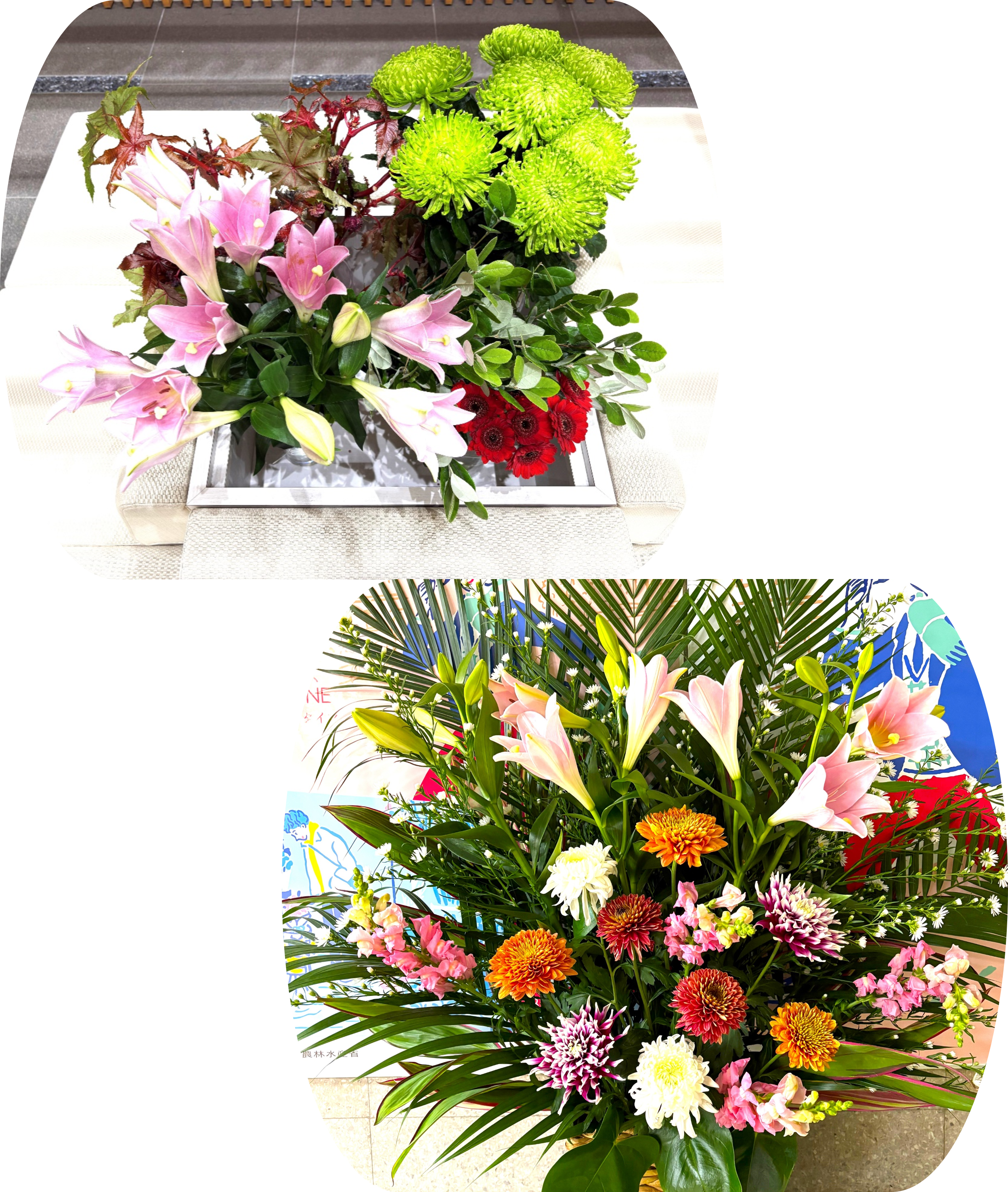 今週は、秋田県産鉄砲ユリなど5種類の切り花とフラワーアレンジメントを展示しています。