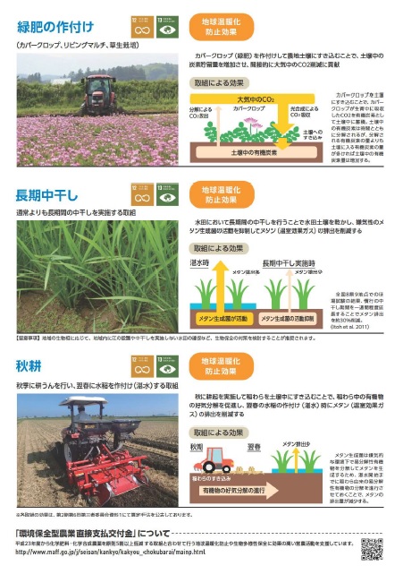 平成23年度から化学肥料・化学合成農薬を原則5割以上低減する取組と合わせて行う地球温暖化防止や生物多様性保全等に効果の高い営農活動を支援しています。 (平成27年度から「農業の有する多面的機能の発揮の促進に関する法律」(平成26年法律第78号)に基づき、日本型直接支払(多面的機能支払交付金、中山間地域等直接支払交付金、環境保全型農業直接支払交付金)の一つとして実施しています。) ※ 本制度は予算の範囲内で交付金を交付する仕組みです。 |