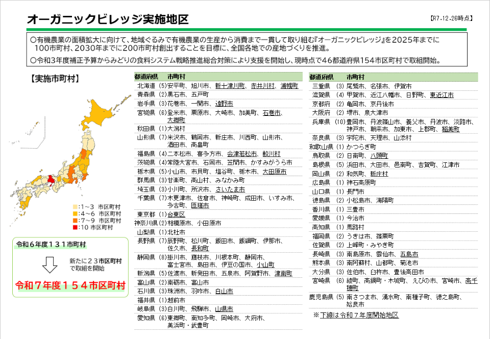 農林水産省では、オーガニックビレッジを令和7年(2025年)までに100市町村、令和12年(2030年)までに200市町村創出することを目標に、全国各地での産地づくりを推進しています。