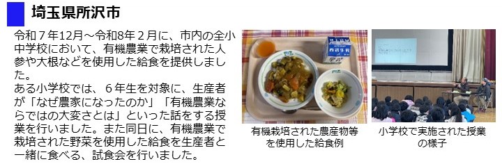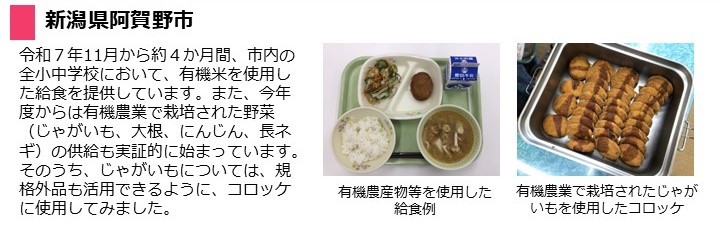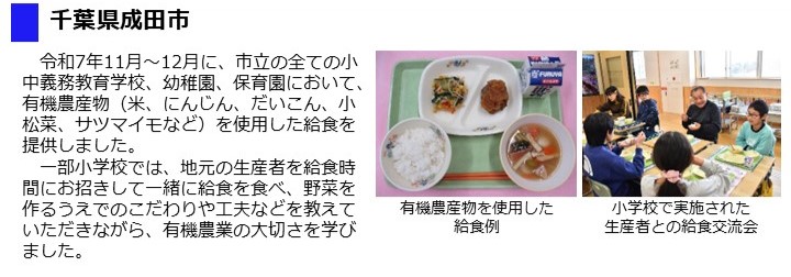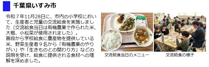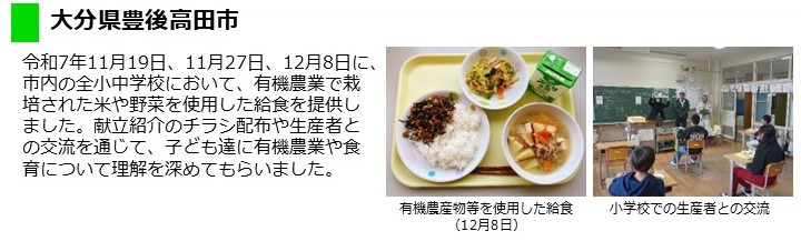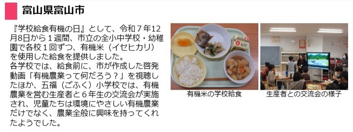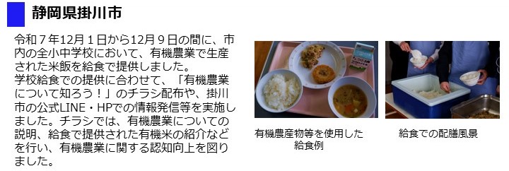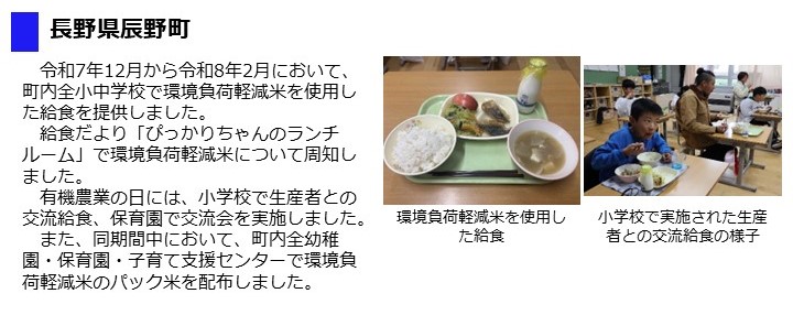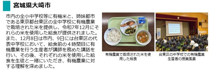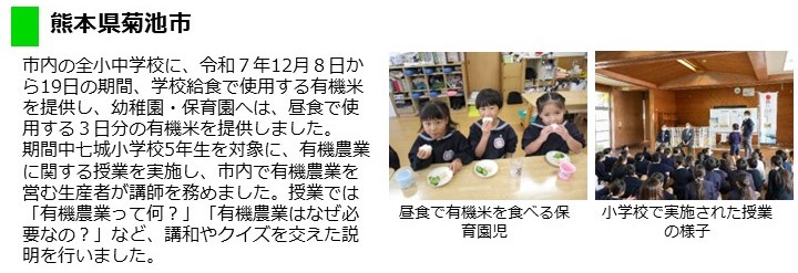 - 市内の全小中学校、義務教育学校の給食に有機米と、姉妹都市である東京都台東区の全中学校に有機農業で栽培された米を提供し、令和7年12月にそれらの米を使用した給食が提供されました。