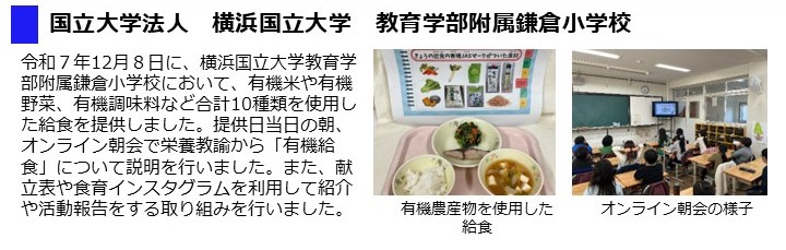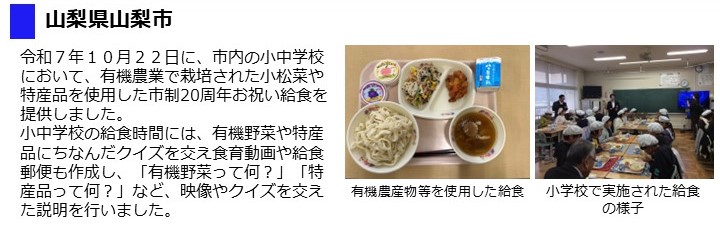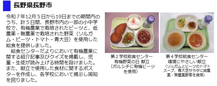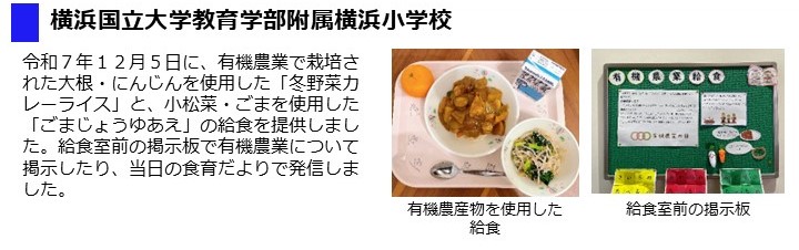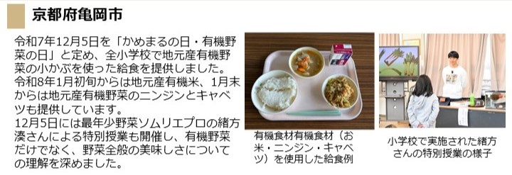 - 令和7年12月5日(金曜日)に、市内全小中学校において有機農産物・有機加工食品等(米、野菜、豆腐、豆乳、味噌)を使用した給食を提供しました。
